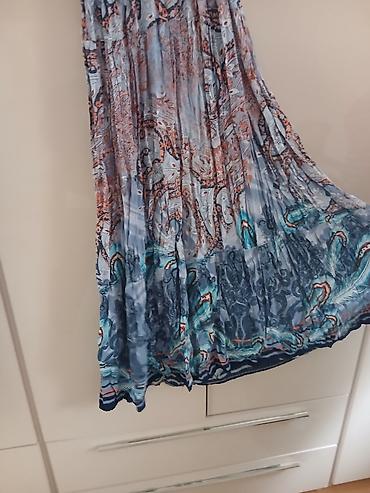- Dizajn: višebojni etno/paiseley print u nijansama plave, tirkizne, teget, svetlosive i rđasto-narandžaste; tamniji horizontalni pojas u struku koji vizuelno sužava figuru