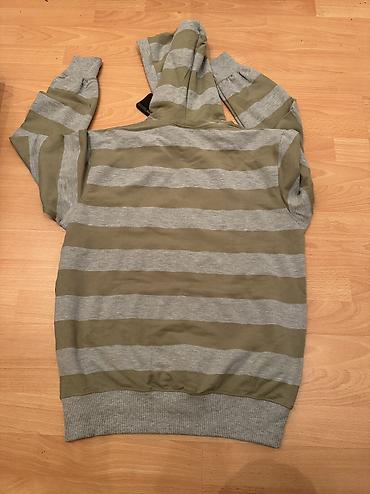 Crna dukserica sa visokim, širokim ovratnikom/rol-kragnom na preklop, unutra u sivoj boji. - Materijal: meki pamučni duks (poliester/pamuk mešavina po izgledu), prijatan i topao. - Zatvaranje: be...