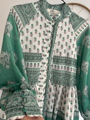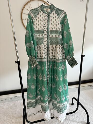 Duga boho haljina sa paisley printom - Model: maxi haljina A-kroja - Dužina: do članaka - Rukavi: kratki - Izrez: blagi V-izrez - Print: višebojni paisley motiv u zemljanim tonovima (terakota, zel...
