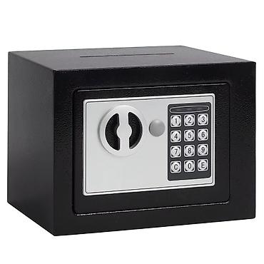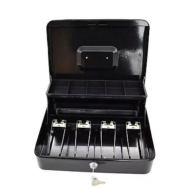 Crna metalna kutija za novac, idealna za organizovanje gotovine i kovanica. Unutrašnjost sadrži pregrade za papirni novac i uklonjivu tacnu sa odeljcima za kovanice. Obezbeđena je bravom na ključ za sigurno skladištenje. Praktično rešenje za čuvanje novca u maloprodaji, na pijacama ili kod kuće.