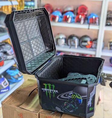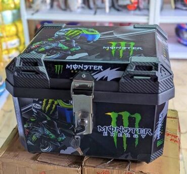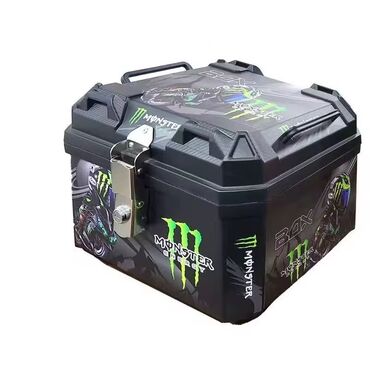 Čvrsta kutija za skladištenje, idealna za motorcikle. Izrađena od izdržljive plastike, poseduje siguran mehanizam za zaključavanje. Dizajnirana je sa elementima „Monster Energy“ brenda, uključujući logo i grafike trkačkih motora, što je čini atraktivnom za ljubitelje motosporta. Nudi praktično rešenje za bezbedan transport i odlaganje kaciga, alata ili drugih potrepština tokom vožnje. Integrisana ručka na vrhu omogućava lako nošenje. Kutija:45 lit - Boja: Crna - Materijal: Plastika - Mehanizam zaključavanja: Metalna bravica - Dizajn: Monster Energy grafika - Ručka: Integrisana na poklopcu