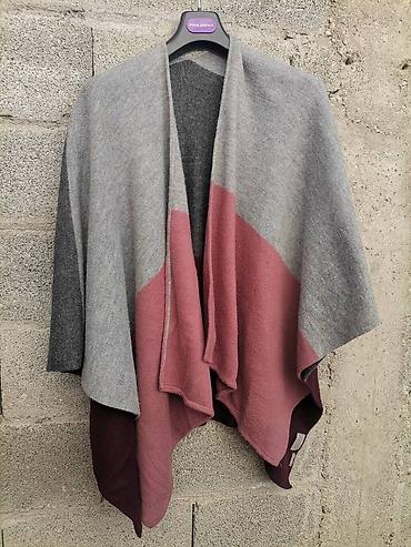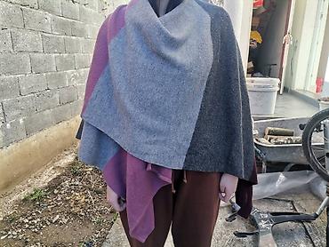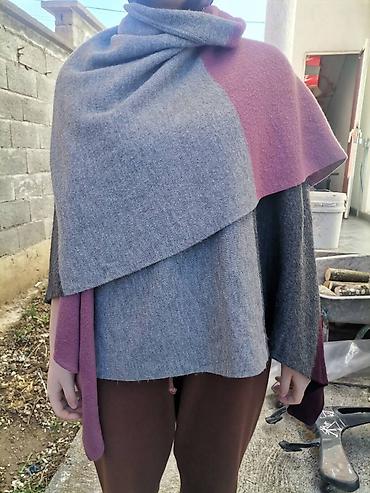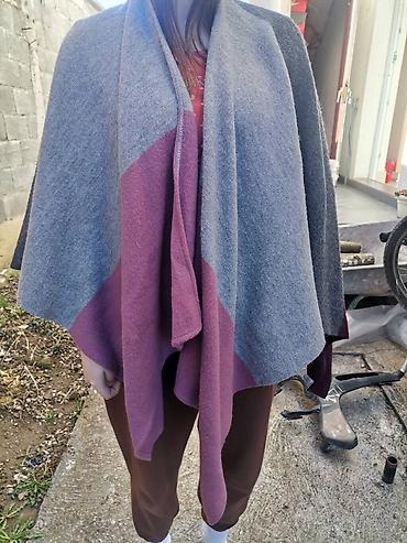 Teksilni pončo/ogrtach u tamnoplavoj boji - Model: asimetrični pončo sa preklopljenim okovratnikom - Zatvaranje: tri dekorativna/funcionalna dugmeta sa strane vrata - Materijal: meka elastična tri...