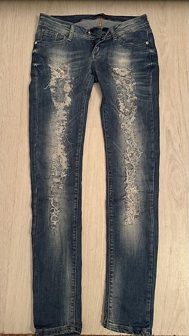 Ženske skinny farmerke – tamno plavi džins sa efektnim detaljima. Naznacena velicina S. (36-43cm) Bok: 42-43cm Dužina: 100cm Dubina: 26cm (normalna) - Kroj: uske (skinny), visoki struk. - Kopčan...