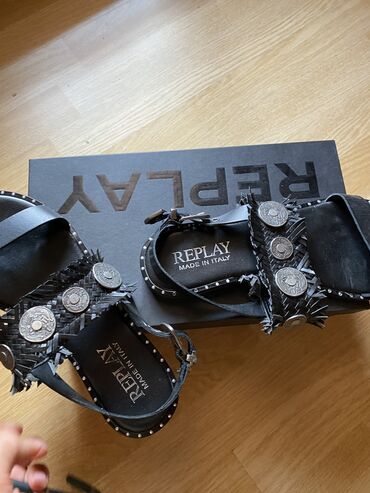 Ženske sandale na platformu - Veličina: 39 (oznaka na đonu) - Gornji deo: kombinacija crne trake i trake u printu imitacije zmijske kože - Kopčanje: dve metalne kopče sa bočne strane za podešavanj...