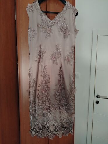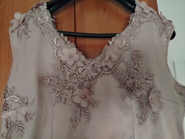 Elegantna svečana haljina bez rukava u puderasto‑bež nijansi.