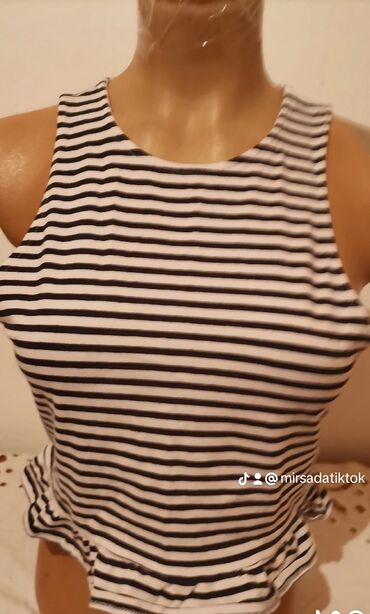 - Prugasti top bez rukava: crno-bele vodoravne pruge, okrugli izrez, rastegljiv prijatan materijal, blago talasasti porub.
