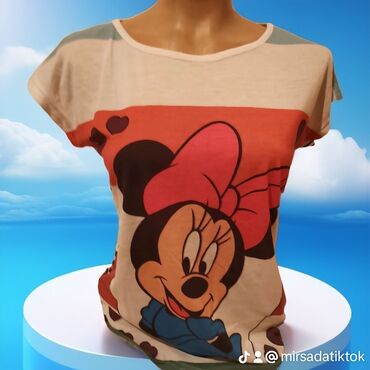 - Majica sa kratkim rukavima sa printom Minnie Mouse: širok okrugli izrez, ravni kroj, mekana pamučna tkanina, višebojni print sa srcima, idealna za svakodnevno nošenje.