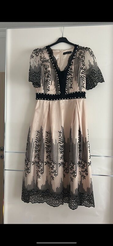 - Midi haljina u boji pudera sa crnim čipkastim vezom: V-izrez, kratki puf-rukavi od tila, dekorativni pojas sa nitnama, bogat čipkani porub; romantičan, retro izgled.