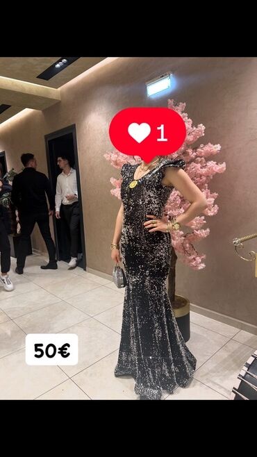 - Sjajna svečana haljina sirena kroja: crna sa srebrnim šljokicama po celoj površini, kratki volan-rukavi, ističe struk i prati liniju tela do proširenog ruba. Cena na slici: 50€.