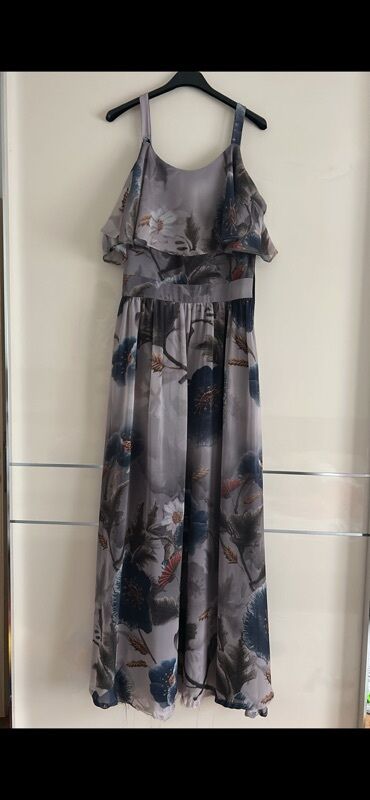 - Duga letnja haljina na bretele sa floralnim printom: sivi tonovi sa cvetnim motivima u plavim i zemljanim nijansama, lepršava tkanina, volan preko grudi, podvijen struk i široka suknja.