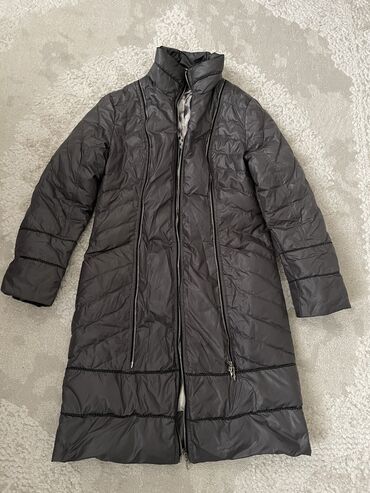 Ženska zimska jakna – pufnast, dugački model - Boja: tamnosiva/antracit, sa blagim prelazima nijansi - Kroj: duža silueta do sredine butina, horizontalno prošivena (puffer) za bolju toplotnu izola...