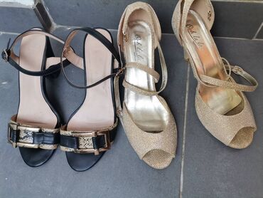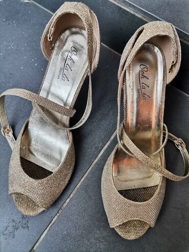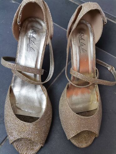 O trošku kupcaZlatne svečane Oh la la sandale. Nošene 2-3 puta. Na obe štikle, pri dnu, malo oguljene pri hodanju kaldrmom. Crne klasične sandale idu uz njih kao poklon. Slanje nakon uplate na račun.