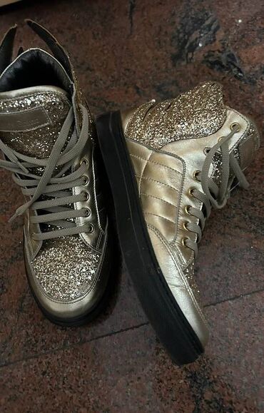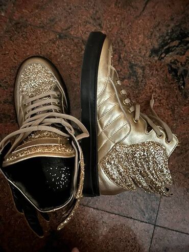 LetnjaPrelazno vremeKožne patike, Just Angels, veoma efektne i kvalitetne, duboke i uklopive u svim kombinacijama. 38 broj,gazište 24cm, kombinacija kože i šljokica, ne propuštaju vodu, ne klizaju se. Zlatna boja. Jednom obuvene.
