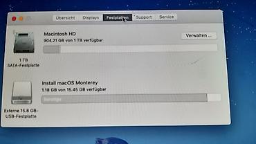 - Operativni sistem: macOS Mojave 10.14.6 (prikazan), instalacioni medij za macOS Monterey vidljiv na eksternom USB-u
