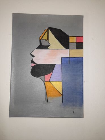 Apstraktna slika na platnu – profil ženskog lica u kubističkom/geometrijskom stilu. Kompozicija je izvedena ravnim linijama i kolor-blokovima, sa naglašenim profilom u crnoj i svetloružičastoj, dok pozadinu čini gradijent sive. Desni deo slike je građen od pravougaonih i trougaonih polja u plavoj, žutoj, narandžastoj, ljubičastoj, sivoj i ružičastoj nijansi, što stvara moderan, grafički utisak.
