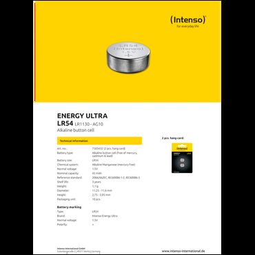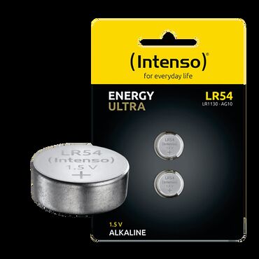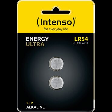 Baterija alkalna LR54/2, 1,5V dugmasta, blister 2 kom. Tip baterije: Alkalna dugmadna ćelija (bez žive, kadmijuma i olova). Veličina baterije: LR54. Hemijski sistem: Alkalni Mangan (bez žive). Normalni napon: 1,5V. Nominalni kapacitet: 45 mAh. Referentni standardi: 2006/66/EC, IEC60086-1-2, IEC60086-5. Rok trajanja: 3 godine. Težina: 1,1 g. Prečnik: 11,25 - 11,6 mm. Visina: 2,75 - 3,05 mm. Oznaka baterije Tip: LR54. Brend: Intenso Energy Ultra. Normalni napon: 1,5V. Polaritet: +.