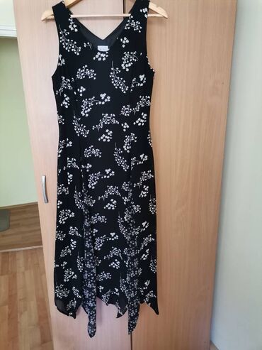 Pri dnu sečena na cikcak pa je definišem kao asimetričnu haljinu. Veličina ne piše, možda oko XL, ali najbolje da pratite dimenzije. Model na slici nosi XS, imajte to u vidu. Materijal ne piše, ne rasteže se uopšte. Ima postavu.