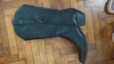 O trošku kupcaPokupiti na licu mestaSniženo!!!Crne kaubojke, nove, obuvene jednom, veštačka koža, prelep model. Broj 38, peta niža, udobna. Predivne!