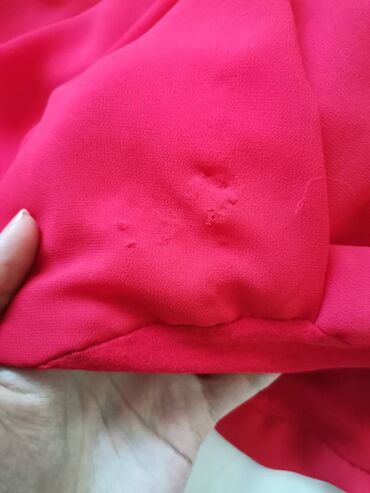 Ima malo oštećenje. Pri dnu je oštećena tokom zakopčavanja jakne. Po meni nije primetno, jer taj deo pada i ide ka unutra. Prikazano je na jednoj slici. Dok sam je prala u mašini, nekoliko končića je povučeno, slikano je i to. Boja je baš crvena, na nekim slikama zbog svetlosti deluje da ide ka roze boji, uživo nije tako.