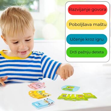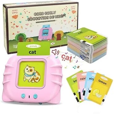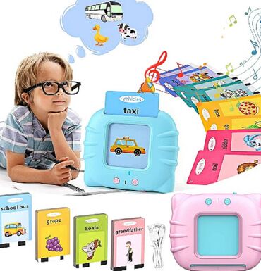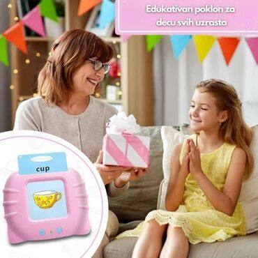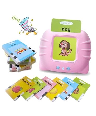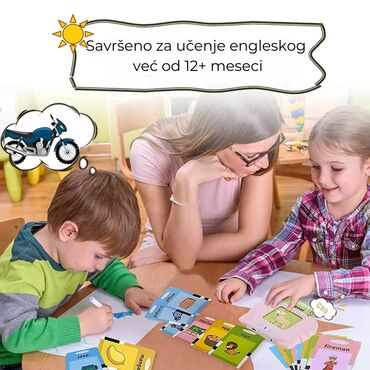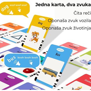 - Edukativni elektronski čitač kartica: ubacite karticu u uređaj i on naglas izgovara reč na engleskom. Za životinje i vozila pušta i odgovarajuće zvukove (npr. “dog” + lavež, “bus” + zvuk autobusa).