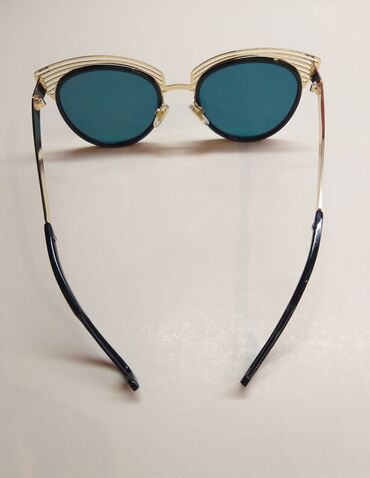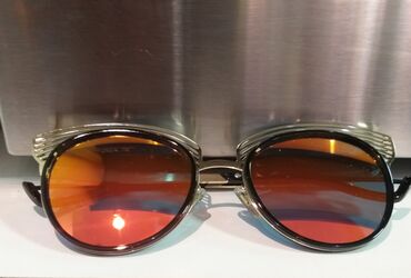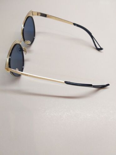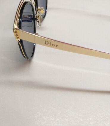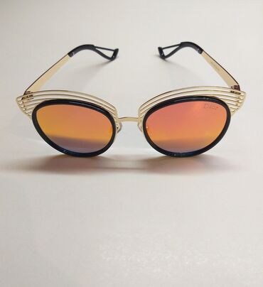 NovoSunčane naočare – okrugli model sa zlatnim metalnim okvirom i crnim obrubom oko sočiva. Dekorativne „stepenaste“ bočne linije daju retro-glam izgled. Sočiva su ogledalasta sa prelazom narandžasta–crvena spolja, tamnozelena iznutra, sa UV zaštitom. Tanke metalne ručice u zlatnoj boji sa crnim završecima, podesivi nosni oslonci za udobno pristajanje. Na sočivu diskretan natpis “Dior”.