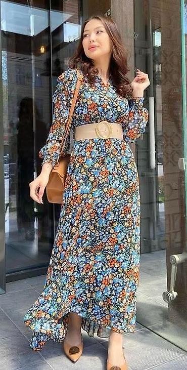 Duga cvetna haljina sa kaišem - Model: maxi dužina, lepršav kroj -