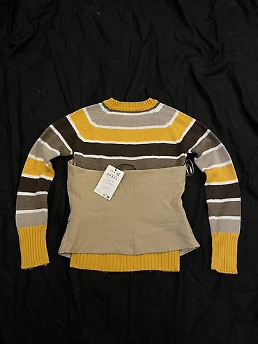 - Gornji deo: pleteni džemper sa širokim prugama u senf-žutoj, braon i bež/sivoj nijansi, rebrasti okovratnik, manžetne i porub.
