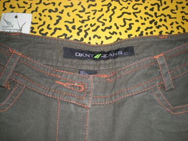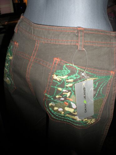 Od maslinasto zelenog kepera, sa narandžastim štepom, sa velikim vezom na jednoj nogavici (žuta, narandžasta i zelena kombinacija) i dva ista takva veza na zadnjim džepovima, samo manja.