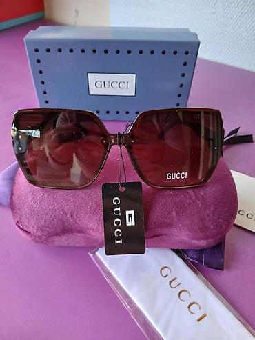 Gucci ženske sunčane naočare, oversized kvadratni/mačkast oblik. Okvir u braon nijansi sa visokosjajnom završnicom i diskretnim metalnim detaljima na krajevima sočiva. Gradijentno braon tonirana sočiva pružaju zaštitu od sunca i udoban pogled tokom jače svetlosti. Na desnom sočivu i na visećoj etiketi istaknut Gucci logo.