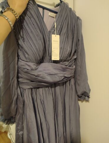 Džemper-haljina, veličina M. Tamno siva boja, dugi rukavi, drapirani karo izrez sa dekorativnim lančićima/perlicama preko grudi i ramena. Uska, elastična silueta koja prati liniju tela. Dimenzije:...1 800 RSD