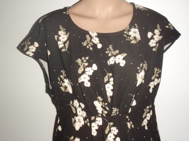 Haljina sa ružama – veličina M - Crna podloga sa belim cvetnim (ružama) printom - V-izrez - Dugi rukavi - Struk naglašen kaišićem/vezicom u istoj šari - Donji deo blago naboran, A-kroja, sa faltam...