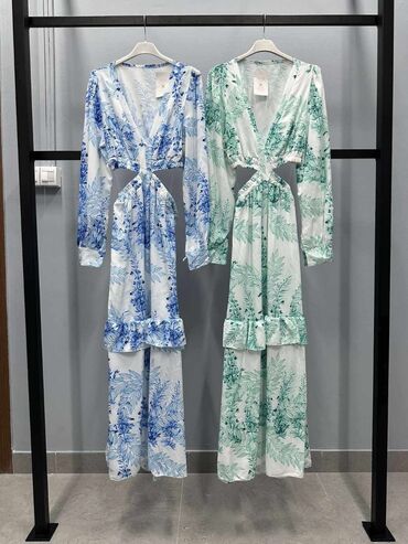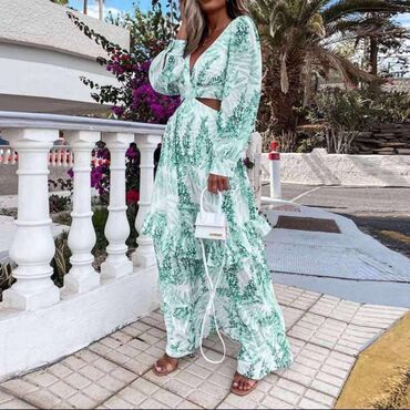 Duga haljina sa cvetnim dezenom, V-izrezom i dugim rukavima sa balon efektom. Haljina ima izreze na struku i karner na donjem delu. Idealna za letnje prilike i opuštene izlaske.