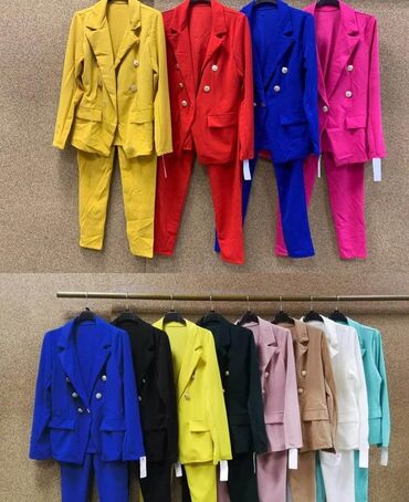 Ženski elegantni komplet – sako i pantalone - Model: dvoredni sako sa zlatnim dekorativnim dugmadima i usklađene ravne pantalone - Kroj: strukirani sako sa reverima, dugmad u dve kolone; džepovi s...