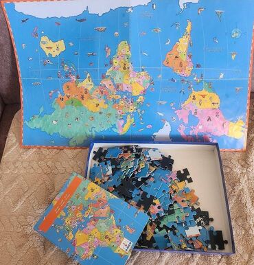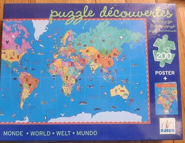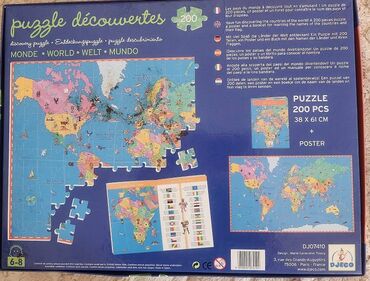 KOMPLET "Istraži svet" se sastoji od 200 komada puzli, koje kad se sklope daju veličinu 38x61cm, postera mape sveta sa zastavama država koje se nalaze na određenom kontinentu, pojedinim životinjama koje tu žive. U paketu je i knjižica sa svakim kontinentom i imenom država i zastavama da bi se grupisale i lakše povezivale. Komplet je dobar start i podsticaj za istraživanje. Same puzle su rađene od kvalitetnog kartona. Razvijaju logičko razmišljanje , vizuelno uklapanje u celinu i finu motoriku. Poster od kvalitetnog papira, koji se može uramiti i daje predstavu sveta za lakše upoređivanje i snalaženje. Knjiga daje osnovne informacije o državama svakog kontinenta i njihovim zastavama. U kompletu je i NTC radni list o državama. Sve je novo , nekorišćeno. Namenjeno je deci od 4-8 godina