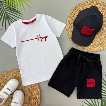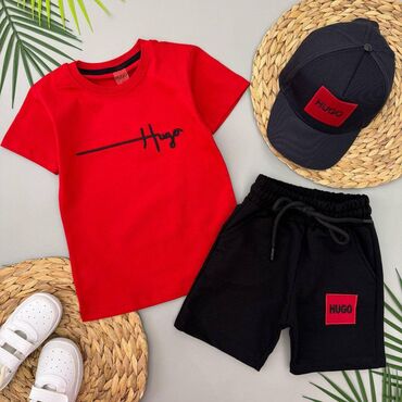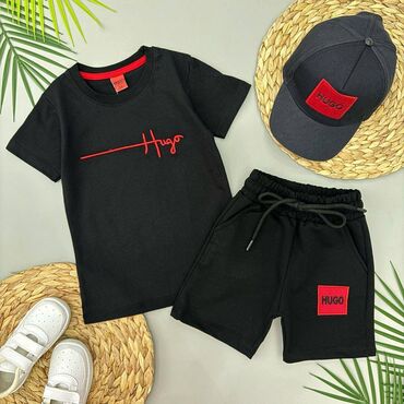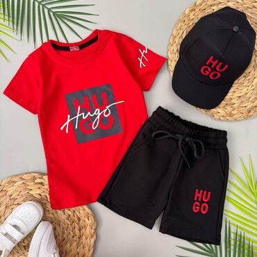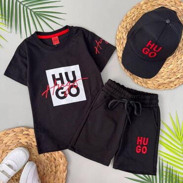 Bez dezenaKomplet za dečake koji se sastoji od majice kratkih rukava, šortsa i kačketa brenda Hugo. Majica je dostupna u više boja i ima prepoznatljiv logo brenda na prednjoj strani. Šorts je crne boje sa elastičnim pojasom i učkurom za podešavanje, takođe sa logotipom. Kačket je crn sa logotipom i podesivom trakom na zadnjoj strani. Idealan komplet za svakodnevne aktivnosti i opušten stil.