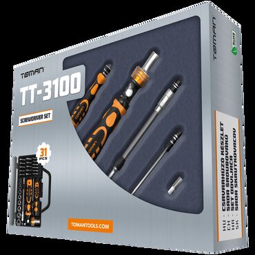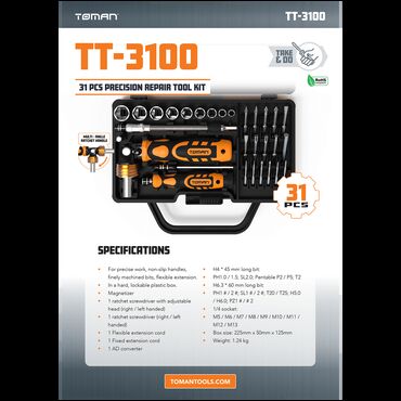 Komplet set alata TT-3100 preporučujemo za precizan rad kod kuće, u bašti ili u radionici. Kompaktan set s dobrim držanjem i fleksibilnim nastavkom, neklizavajućim odvijačima, fino obrađenim bitovima, ključevima pomoću kojih rad čini zadovoljstvo. Uređen, dobro sređen raspored u praktičnoj tvrdoj plastičnoj kutiji koja se zaključava. Žuti okvir je lako pronaći čak i pri slabom osvetljenju. Zbog svoje male veličine uklapa se u fioku , a zbog male težine (1,24 kg) možete ga poneti bilo gde sa sobom. Odličan kvalitet i dugi vek trajanja Set uključuje 1 zasebni magnetni držač bitova, 1 odvijač sa račnom i fleksibilnom glavom (levi/desni smer), 1 odvijač sa fiksnom glavom (leva/desna ruka), 1 fleksibilni nastavak, 1 fiksni nastavak, 1 AD nastavak, H4 * 45 mm dugačak bit: PH1.0 / 1,5; SL2.0; precizan set P2 / P5; T2 H6.3 * 60 mm dugačak bit: PH1 # / 2 #; SL1 # / 2 #; T20 / T25; H5.0 / H6.0; PZ1 # / # 2 1/4 adapter, M5 / M6 / M7 / M8 / M9 / M10 / M11 / M12 / M13