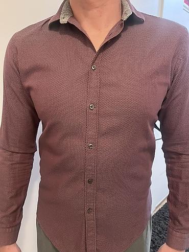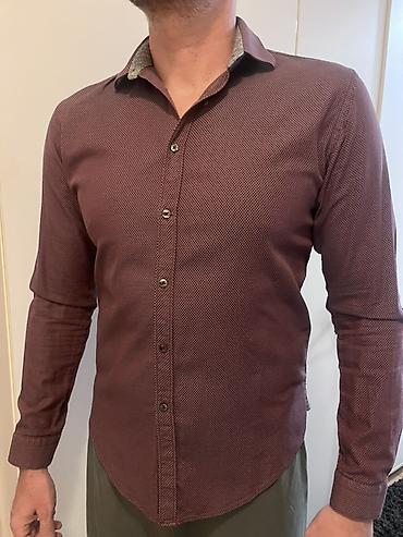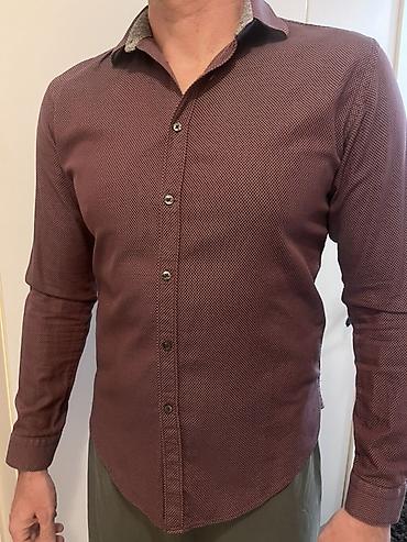 Muška košulja na dugmad, dugih rukava, slim kroja. Boja: tamno bordo sa diskretnim mikro-šarama (tačkasti/geometrijski dezen). Klasična kragna sa kontrastnom unutrašnjom stranom (svetlosiva melirana), koja daje elegantan akcenat kada je kragna delimično podignuta ili raskopčana. Prednji panel sa nizom tamnih dugmadi i ojačanim rupicama, ravni manžetni sa jednim dugmetom. Zakrivljen donji rub prilagođen za nošenje u pantalonama, ali dovoljno uredan i za nošenje preko. Tkanina je glatka i lagano elastična, prijatna za celodnevno nošenje. Univerzalno nosiva – od poslovno-kežual kombinacija do večernjih izlazaka; odlično ide uz tamne farmerke, chino ili elegantne pantalone.