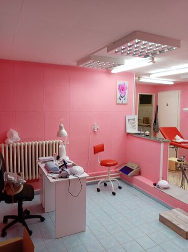 - Svetao, uredan prostor sa roze zidovima i keramičkim podom, podeljen na radni deo sa pultom i odvojenim ležajem.