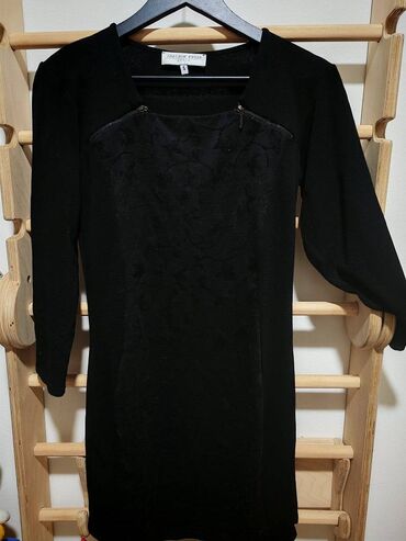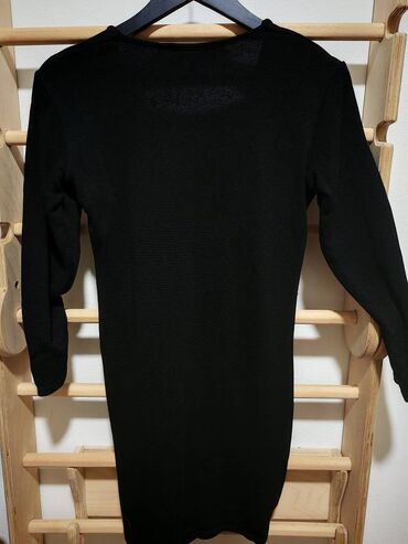 Haljina crna pamučna,sa središnjim detaljem od poliestera i pliša, sa dodatkom elastina, okruglog izreza i šlicevima sa obe strane izreza, zatvorenih leđa, dugih rukava, veličina 5 ili 38, a dimenzije su 41cm čirina ramena, 43 poluobim grudi, 36 struk, 93 cm dužine. Kupljena u Hamburgu, nošena par puta, veoma prijatan pamuk, pogodna za svakodnevno nošenje ali i za izlaske.
