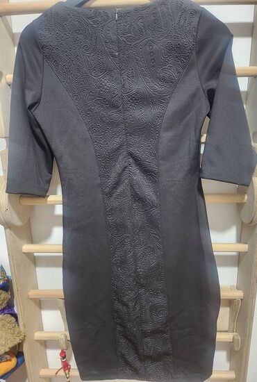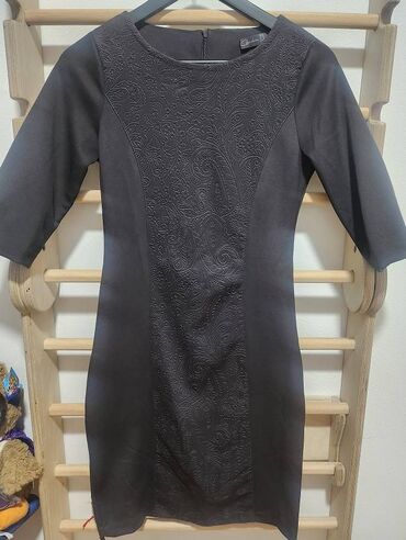 SNIŽENJE-Haljina, tamno sive boje, sa središnjim delom od teksture, midi dužine, M veličine, kopčanje na leđima na cibzar. Zbog teskture daje utisak vitkije figure. Prati liniju tela,rukavi 3/4. Jednom nošena.