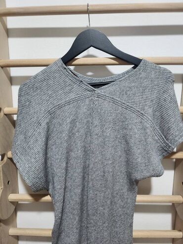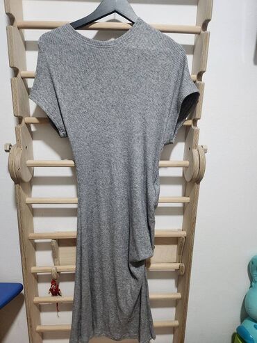 SNIŽENJE-Siva, rebrasta asimetrična maksi dužine Jagger haljina, sa širim padajućim rukavima, mekana i nežna, od viskoze, poliestera i najlona, jednom obučena. M veličina.