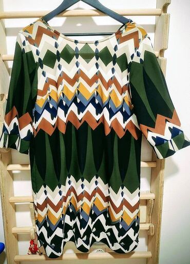 Drugi brendItalijanska tunika haljina, par puta nošena, veoma efektna, lagana, prijatnog materijala i praktična u svim godišnjim dobima i situacijama. Materijal je elastin i poliester. Lako se održava i ne pegla se pa je praktična za put. Veličina je M, iako se vodi pod UNI.Dužina je malo iznad kolena a rukavi su 3/4. Kopčanje na dugme iza vrata.