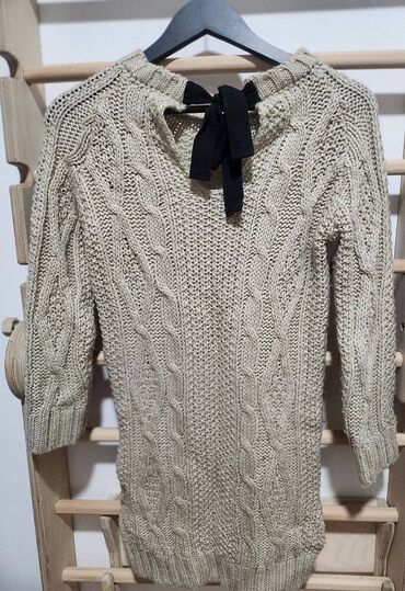 O trošku kupcaTunika džemper, od vune i akrila, sa čamac izrezom oko vrata, 3/4 rukavima, i crnim plišanim vezivanjem na vratu, pozadi. M veličina, jednom obučen. Prednji deo je kraći za rub od zadnjeg dela džempera.