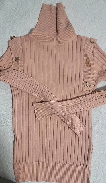Rolka od kašmira, pamuka, vune i elastina. Nežno roze boje, fenomenalnog kvaliteta i baršunasto meka. Veličina S/M, dobijena iz Francuske. Na poklon u istoj boji vunena traka za uši sa smaragdno zelenim kamenčićima.Novo nenošeno.