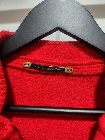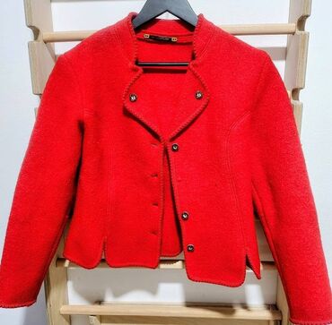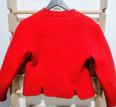 Jesenji, deblji sako jakna za prelazno vreme. Materijal akril, vuna. Na kopčanje, dugih rukava, vatreno crvene boje. Veličina je M ili slabiji L. Nema etiketu sa veličinom, pa su mere sledeće:širina ramena 42cm, dužina sakoa 56cm, širina od pazuha do pazuha 47cm, dužina rukava 55cm. Nenošen