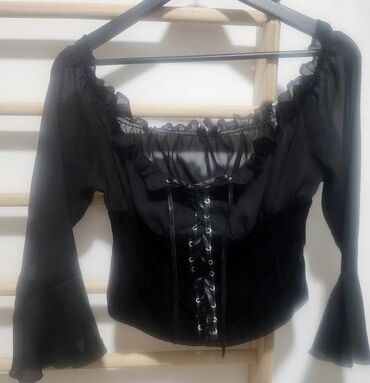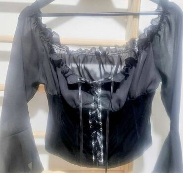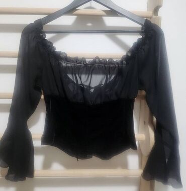 Crna ženska bluza sa otvorenim ramenima i visokom kragnom. Asimetričan kroj: jedno rame potpuno otkriveno, drugo sa širokim, lepršavim rukavom u zvono. Prednji deo se preklapa i blago je kraći, sa ...