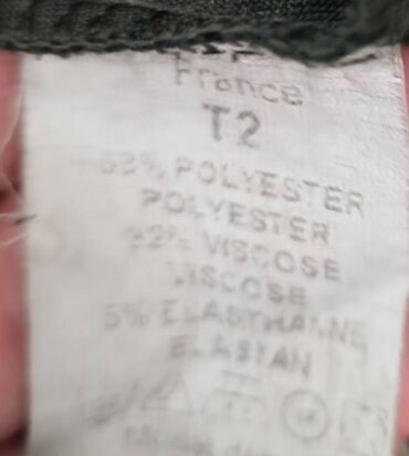 PoliesterCrne pantalone od viskoze poliestera i elastina, nisu sečene pa savršeno oblikuju zadnjicu i bokove.Kopčanje napred. Struk blago dublji. Nogavice na crtu. Prate liniju tela, nisu uske , široke, ni redovan kroj. Veličina 38, donete iz Franscuske, nošene, očuvane.