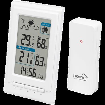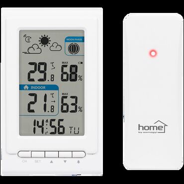Meteo stanica sa satom i bežičnom spoljnom jedinicom • Kućna meteo stanica sa spoljnim senzorom • Prikazuje prognozu vremena i mesečeve cikluse animiranim simbolima • Na displeju prikazuje spoljnu i unutrašnju vlažnosti vazduha i temperaturu, kao i trend promene temperature • Mogu se povezati ukupno 3 spoljne jedinice (1 kom. u sklopu isporuke; model HCKK10) • Poseduje i budilnik sa funkcijom odlaganja