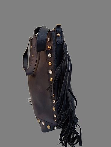 - Dizajn: bočne rese od brušenog materijala i ukrasne nitne po ivicama (kombinacija zlatnih kugličastih zakovica i kristalnih kamenčića)