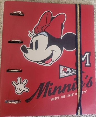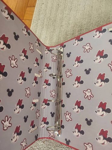 O trošku kupcaNOV registrator sa gumom i četiri prstena , tamno crvene boje i motivom Minnie Mouse.